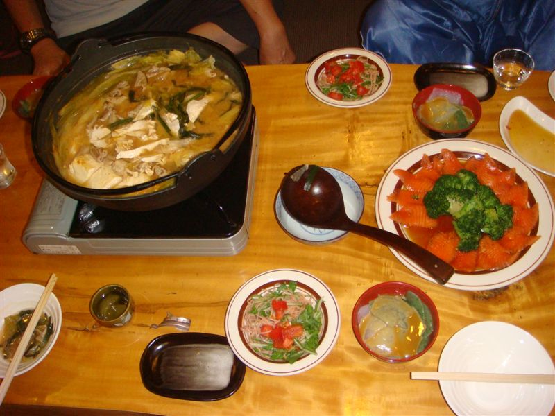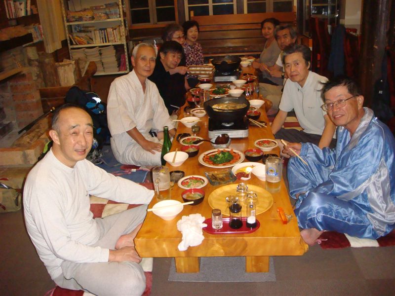 至仏山を登って暗くなっての到着ですが暖かいなべを囲んでの大宴会初日のスタートです。オーナーが射止めた鹿の背ロース生肉をいただきました。小鹿と親鹿の味と食感の違いがあると・・・(ちょっと分からなかった)でもとても柔らかで癖のないお肉です。盛りだくさんのお料理に舌鼓を打ちながら・・・・