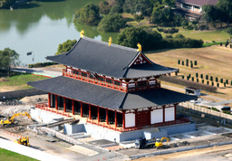 奈良県で来年開かれる平城遷都1300年祭(HPはこちら)のメーン会場、平城宮跡で、復元中の大極殿の全体像が姿を現した。工事用に覆っていた「素屋根」が解体され、屋根の東西で金色の鴟尾が輝いているのが見える。(写真は朝日新聞から借用)大極殿は天皇の執務や儀式の場だった建物で2001年度から復元工事が始まり、規模は東西44メートル、南北19.5メートル、高さ27メートルで、総工費は約180億円だそうだ。内部に「朱雀」「玄武」「白虎」「青竜」の四神などを描き、天皇が座っていた高御座復元品などを展示される予定とある。2010年04月24日からの平城遷都1300年祭から公開されるとHPにあった。しばらく奈良や京都に行っていないので来年は行こうかなと思っている。吉野の桜も見たいし。