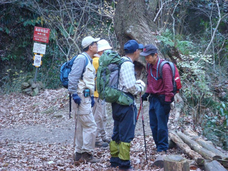 登ったと思うとまたくだりの連続で結構疲れます。健脚ぞろいなので超スピードで歩いていきます。途中山桜の並木があります。桜の咲くころの春はきれいでしょうね。仙元山まで行こうと当初計画していましたが富士山は雲にかかっていたので計画変更して途中から森戸川コースに下り、川沿いに歩くことにしました。