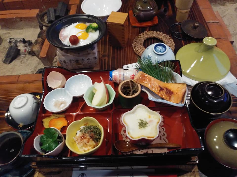 夕食、朝食とも豪華で囲炉裏端での食事はとってもおいしかったですよ。