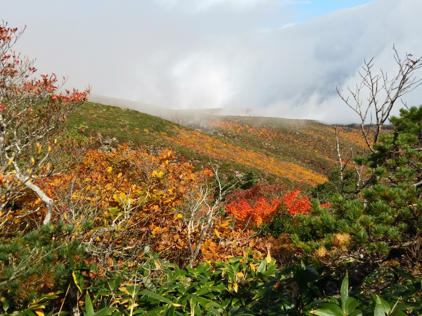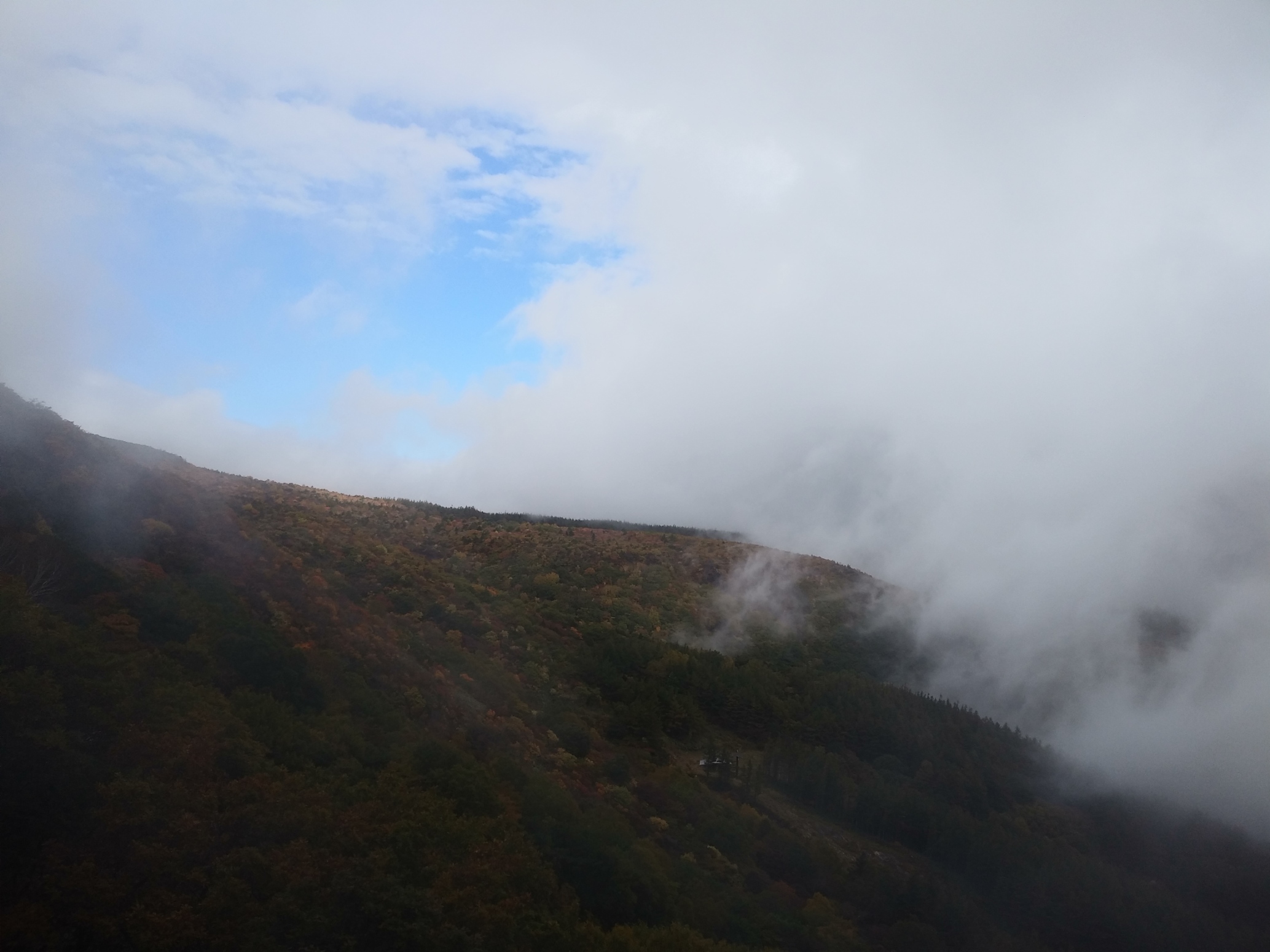 時折ガスが晴て紐紅葉に日が当たりだしました。