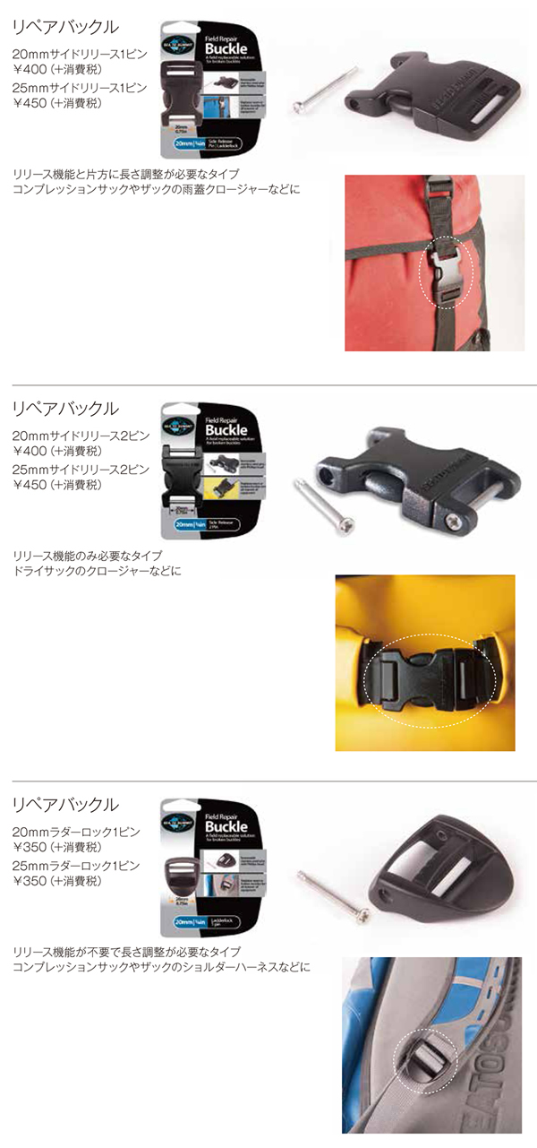 アウトドアブランド「SEA TO SUMMIT」から発売されており、破損や劣化したバックルを、簡単スピーディーに交換できます。用途に応じて、2サイズ3種類あるので助かります。自分で簡単に修理ができそうなのでぜひやってみましょうね。