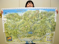 愛媛県西条市が石鎚山系の動植物や山々の標高などが一目で分かる「石鎚山散策絵図」を作製した。絵図は縦約60cm、横約90cmで両面カラ ー印刷で700円で販売をしている。全国の山などの散策絵図を作っている人と市の担当者が現地を回り約1年かけて完成させ、5月から石鎚 山ハイウェイオアシスや石鎚ふれあいの里などで販売を始めている。地図には石鎚山周辺の山々の標高や外国人観光客にも分かるようにロ ーマ字が振られているほか、オオタカやヤマネなど生息する動植物も記されている。裏面には石鎚山系の自然を写真などを交えて紹介され ており石鎚山も説明されているので登山する方は必携ですね
