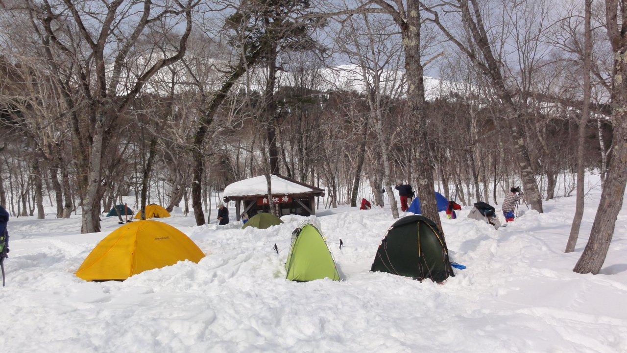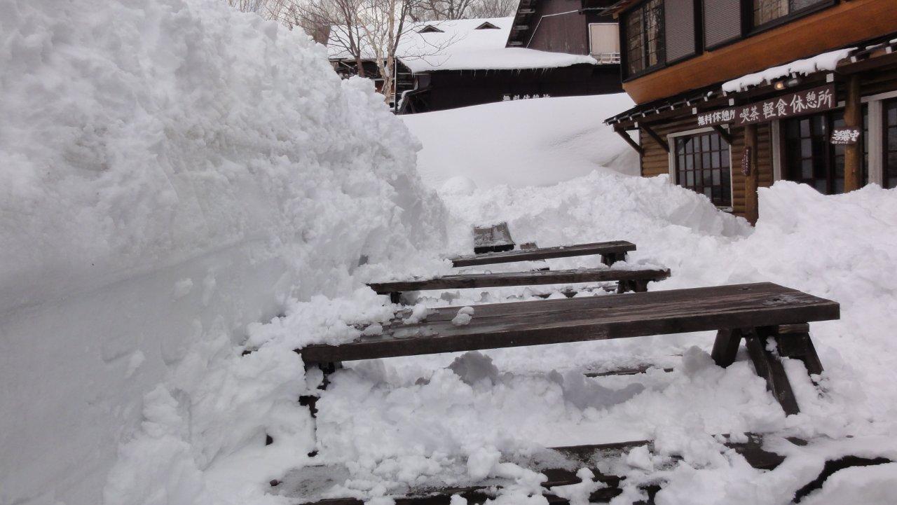 昼食前に小屋の前のベンチとテーブルの除雪をお手伝いしました。