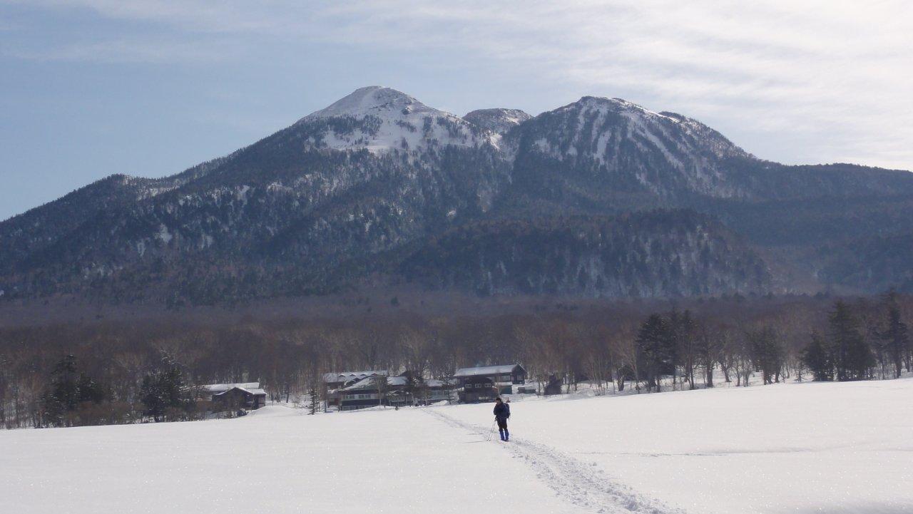 桧枝岐小屋、燧ケ岳また来るからねと別れを告げ白銀の尾瀬ヶ原を山の鼻に向かいます。