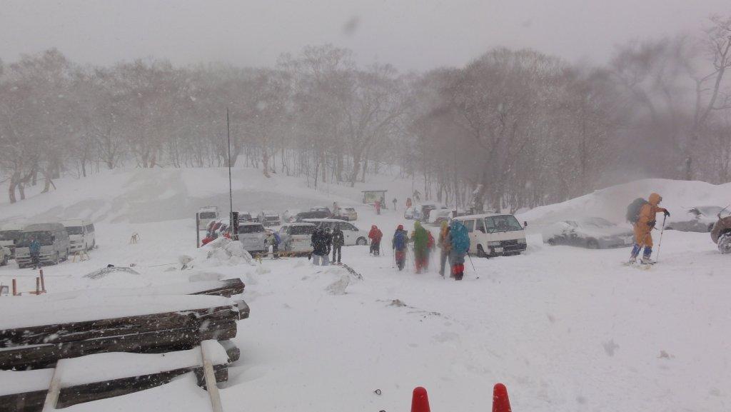 桧枝岐小屋のひげくまさんが団体のお客さんを迎えに行ってきて小屋まで行くとのこと。よかったよかったで後をついていくことにしました。無理をしたら方向を見失って遭難もありうる状況でした。せっかくタブレットで一確認できるようにしてきたのですが吹雪の中ザックの中から出す余裕がありませんでした。(後でメンバーからの非難轟々でした・・・)