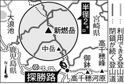 2011年1月の霧島連山・新燃岳噴火以降は利用が禁止されている霧島市の高千穂河原と中岳登山道の途中にある探勝路の開放を鹿児島県が検討してようだ。 調査や整備を行い、ゴールデンウイーク前をめどに開放する予定とのことです。中岳登山道は警戒区域内で、登山禁止が続いているが開放されるのは、高 千穂河原から約1.2Kmの探勝路最高到達点に至る3つのルートでミヤマキリシマの群生が楽しめる場所だ。到達点より先は中岳の登山道につながるためにロ ープや看板を設置して登山禁止の周知徹底を図るそうだ。再度調査して最終的に開放するか判断するそうなので確認してから出かけましょうね。