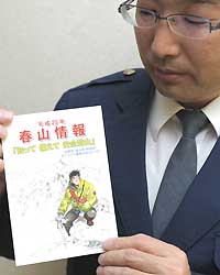 三歩を起用した北アルプスの春山情報冊子が発行された。長野県警地域課が登山客が集中する春の大型連休(4月27日~5月6日)を前に長野県内山岳の積雪 量などをまとめた春山情報を発表したが積雪量は例年並みだが、油断せず、冬山と同じ装備で入山してほしい」と呼び掛けている。4月9日の積雪量は北ア では八方池山荘で1.1m、栂池山荘で2m。中ア・ホテル千畳敷で4m、八ケ岳・赤岳鉱泉で50cm。長野県内山域ではいずれも沢筋を中心に残雪があるという。 昨年は連休後半で天候が崩れて例年より少なめだったがことしは天候次第で1万5千人程度まで増える―と予想している。2012昨年1年間の遭難者279人のう ち居住地別で最も多かったのは東京都の50人で昨年の大型連休には北ア白馬岳で県外在住者6人が死亡する遭難も発生しており長野県警は今後、東京都、愛 知県、大阪府で啓発活動をするそうだ。春山情報の冊子の表紙には県山岳遭難防止対策協会特別隊員に3月に就任した漫画「岳」の主人公・島崎三歩を起用 し遭難しないための要点を記した「山登り10訓」(先月の日記に書きました)を初めて掲載し「登りたい山より登れる山」などと注意を呼び掛けている 。