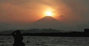 茅ケ崎市の写真愛好家三山静雄さんが、富士山頂部と太陽が重なる「ダイヤモンド富士」の撮影に成功し東京新聞に投稿している。4月5日日17:45ごろに 自宅近くの茅ケ崎海岸ヘッドランドエリアで富士山頂の真上で夕日が鮮やかに輝く様子を撮影したとのこと。湘南地域では、ダイヤモンド富士は毎年4月上 旬と9月上旬に晴天で空気が澄むなど気象条件が整えば見られるそうですが見事な瞬間ですね。