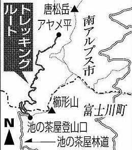 南アルプス市が櫛形山(標高2052m)西側斜面にトレッキングルートの整備を南アルプスの山々を一望できるエリアもある全長約5.5Kmを2013年3月の完成を目指しはじめている。市は5~6月に櫛形山の自然環境に詳しい有識者や専門家らに依頼して希少動植物の生息域などについて調査し、計画ルート付近に県のレッドデータブックで絶滅危惧種に指定されている植物2種が確認されたが、ルート付近に生息する希少植物の移植を行うなうなどして着工したようだ。移植は問題ないのかな?トレッキングルートは富士川町の池の茶屋登山口(標高1850m)からアヤメ平(標高1900m)を結ぶ全長約5.5Kmなので楽しめそうですね。 参考:山梨日日新聞