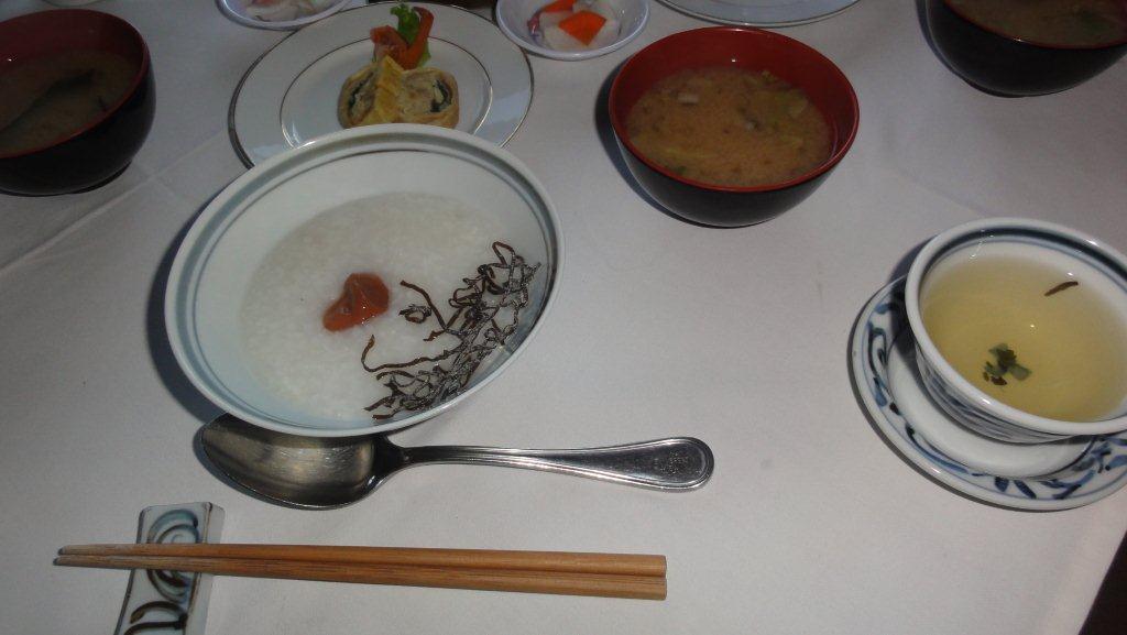 朝食はおかゆです。梅干がおいしいです。