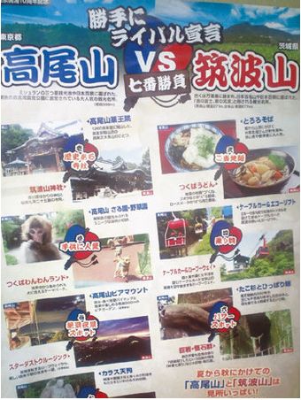 つくば経済新聞に筑波山から八王子の高尾山に「ライバル宣言」を出す企画が展開されているとでていた。筑波山温泉協同旅館組合が企画し八王子やつくばの観光協会両者が協力して始めているようだ。現在はポスターの制作し掲示しているだけのようだがポスター内では七番勝 負と銘打ち、筑波山と高尾山の似通う部分の比較をしていく内容が載っている。(写真参照)ポスターは都内の主要駅に貼り出されたようです が見たことありますか。8月1日~14日の2週間限定で貼り出したようなので私は見ませんでした。現在は都内ではポスターを掲出していないが 筑波山の一部ホテルや旅館などで見ることができるそうです。どちらの山も人気があるのでさらに観光登山客が増えそうですね。