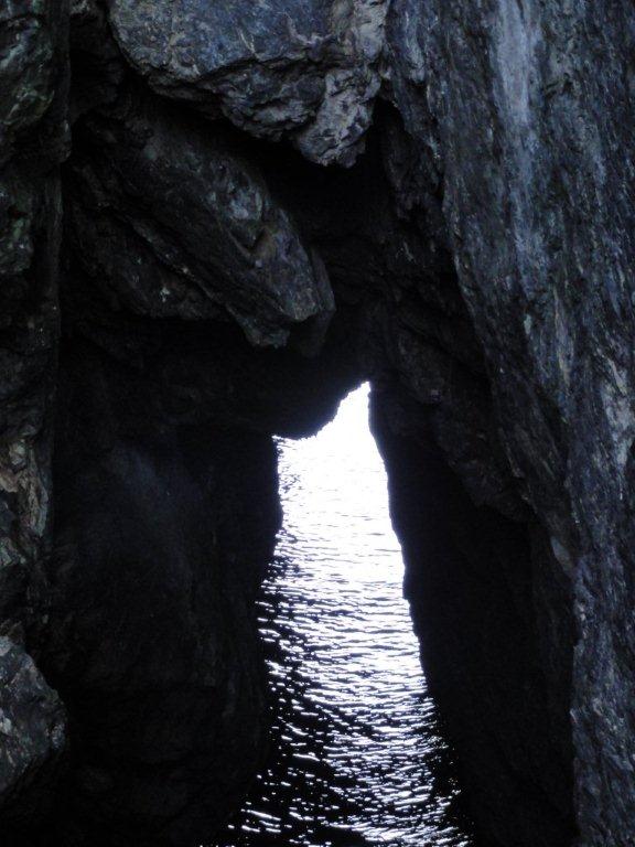龍舞崎には乙姫様が流れ着いたという伝説が残る“乙姫窟(おとひめいわや)がありますがそこに降りる岸壁の階段が崩れかかっていて 立ち入り禁止ですが注意深く降りてみました。反対側の海が見えそうですがこれ以上降りるのは危険なのでこの写真しか撮れませんでし た。