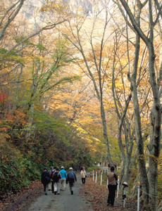 山の紅葉もだいぶ麓まで降りてきたが谷川岳一ノ倉沢への黄葉のブナ林の間を歩き一ノ倉沢を目指すのは気持ちよさそうですね。 日本三大岩壁の一つの谷川岳の東斜面、一ノ倉沢までは、ブナの原生林の間を通る幅5mほどの道で標高差がほとんどなく、子ども連れの 家族や高齢者、肩にバッグをかけた女性、さらに車椅子でも歩けるので人気です。みなかみ町湯檜曽の谷川岳ベースプラザから4km足ら ずで急峻な岩壁を見上げる一ノ倉沢出合にいけます。一ノ倉の紅葉はほぼ過ぎたがこの林道はまだ雪が降るまで人気があるようで初雪の ころを選んで来る人もいるとのことです。