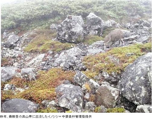 岐阜県高山市の北アルプス・乗鞍岳の高山帯でイノシシによる高山植物の掘り返し被害が相次いでいるようだ。中部森林管理局によると 、本来は高山帯に入り込まないイノシシが好物の球根を求めて出没しているという。周囲には国の特別天然記念物・ライチョウが生息し ており、専門家は「このまま放置すればライチョウの餌となる高山植物が減少し、生存が脅かされる。早急な対策が必要だ」と指摘して いる。対象は昨2010年に被害を確認したエリア約2haで今年はそのうちの3~4割程度が掘り返され、イノシシの足跡とふんも数個ずつ見 つかった。イノシシはセリ科の植物の球根を好み、高山帯に入り込むと貴重な高山植物が激減する恐れがある。北アルプスの高山帯でイ ノシシが確認されるようになったのは数年前からで、専門家は「平地で個体数が増え、餌不足になっているのではないか」とみている。 さらに、最近ではツキノワグマやオコジョ、アナグマなどの目撃報告も増えており、ライチョウへの影響が懸念されるという。畳平のお 花畑でライチョウをよく見かけますがシカや熊のほかにも天敵が増えて困り物ですね。 参考:読売新聞