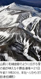 いよいよ冬ですね。本格的な冬の訪れはまだのようだが標高2000m級の山々が連なる北海道の屋根・大雪山系では、山肌にはけで掃いた ような雪の筋が広がっている。10月21日北海道新聞社のヘリで十勝岳連峰上空を旋回した時の写真だそうであまりにきれいなので借用し てしまった。十勝岳(2077m)から北東方面に連なる尾根周辺の黒っぽい山並みには、白いしま模様が幾筋も浮かび上がっていて見事で すね。記者さんはうらやましいです。