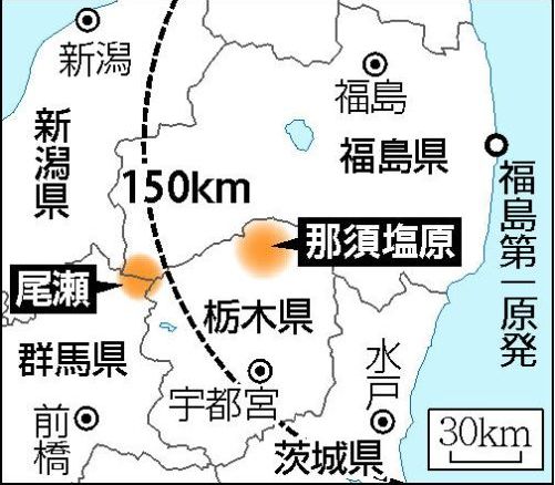 写真を見てください。福島第一原子力発電所から150Km以上離れているのに尾瀬や栃木・那須塩原が、観光客の減少に苦しんでいるようだ 。福島県檜枝岐村の観光客は前年比3割減の状況で、ニッコウキスゲが見頃となる7月中旬の書き入れ時を前に困っているとのこと。福島県側の入山 口にあたる檜枝岐村によると『福島県内なので心配になった』という人がおおく福島と名が付くだけでどうも客足が遠のいているようだ。 福島県の放射線測定では、檜枝岐村役場の最大値は3月21日の毎時0.12マイクロ・シーベルトで7月3日でも同0.1マイクロ・シーベルトと、 水戸市の0.093マイクロ・シーベルトよりわずかに高い程度でまったく健康に問題ないとしている。尾瀬沼に近い山小屋は例年、ニッコウ キスゲが見頃となる7月中旬~下旬は予約でいっぱいになるが、今季の満室は2日間だけこの山小屋の担当者は「風評被害と考えざるを得な い」はなしているそうだ。自然を愛する人は風評被害を打ち消すよう行動しましょう! (参考:読売新聞)