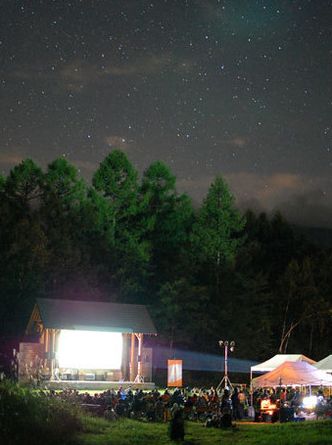 写真は9月11日に行われた乗鞍高原野外特設会場の様子です。9月11日に乗鞍高原で行われた上映では、野外 に特設会場を設置。満天の星空の下、雪山をベースとした映像作品「icon」シリーズを手がける映像作家・ 関口雅樹さんによる3分間の短編作品「Deep/Shinsetsu(ディープ/深雪)」など、特別プログラムによる長 編・短編合わせて5本が上映され、通路に置かれたランタンの明かりが会場をほんのり照らす中で、地元カフ ェが提供するドリンク片手に、詰め掛けた約300人はひんやりした空気も楽しむかのようにアウトドアスタイ ルで作品を堪能したそうです。行きたかったですね。残念!