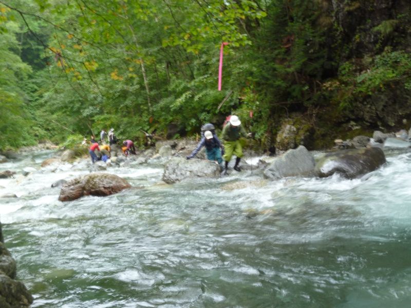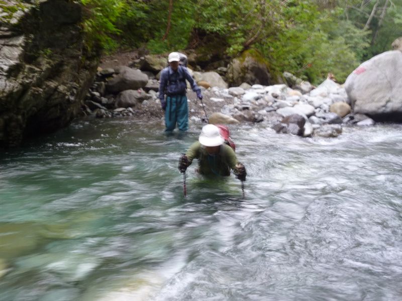4回目の渡渉点は腰の上程度までの水があり、流れが速く危険な状態。 河原の石に埋め込みボルトがあったのでザイルを出し、そこを基点に確保しながらの渡渉。写真がブレてい て、臨場感がありますね。ストックが激しい流れのためブルブル震えます。前に出す足も流れに流されてし まいます。必死に踏ん張って体勢を立て直してから次の一歩を出します。渡渉点には赤テープの目印が一応 あるが、テープがなかなか見つからないしテープが無いところも多く河原の石のもペンキなどの指示が無い 。河原にもルートの指示が無く、北アルプスなどと比べると全く何も整備されていないそうだ。