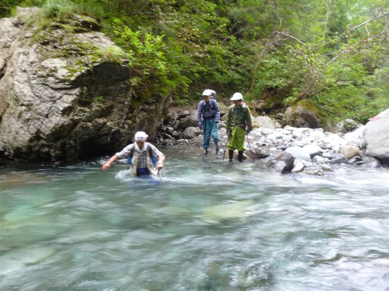 30分くらいのところで第一渡渉点。ここで登山靴を沢用の靴に履き替え、以後水は腰の辺りまであり 予想より厳しい渡渉の連続となる。