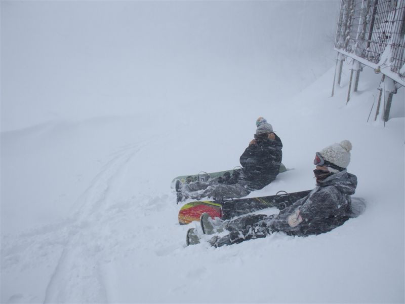 ゲレンデの頂上に着いたら若いお姉さん2人がスノボーかついであがってきたそうだ。(写真は友人撮影2008/2/24)友人は1本滑って帰ってきた。雪は新雪で最高だが視界が悪く吹雪の中ではやはり何本も滑る気力がなくやめたそうだ。雪に埋もれた車の雪おろしをして荷物を積んで早々に帰路についた。