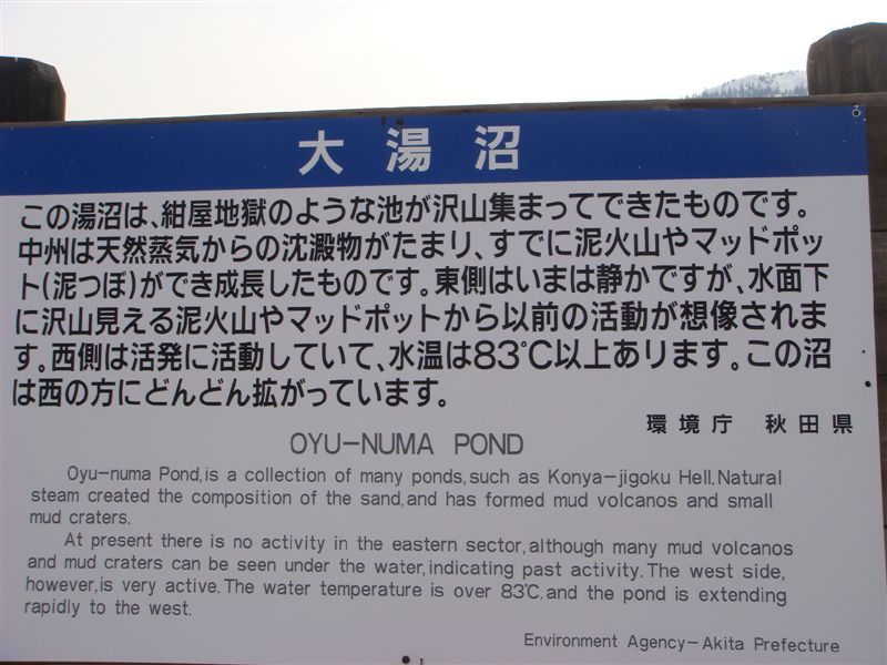 この自然研究路は後生掛温泉宿に入り口がありここの温泉の源泉となっている。オナメ・モトメ・大湯沼の伝説の解説案内の写真です。