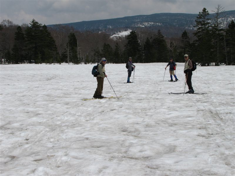 山頂から八幡沼の小屋に向かっては斜面がありここはテレマークで気持ちよくすべって下りたがシャーベット状の雪はあまりすべりが良くない。