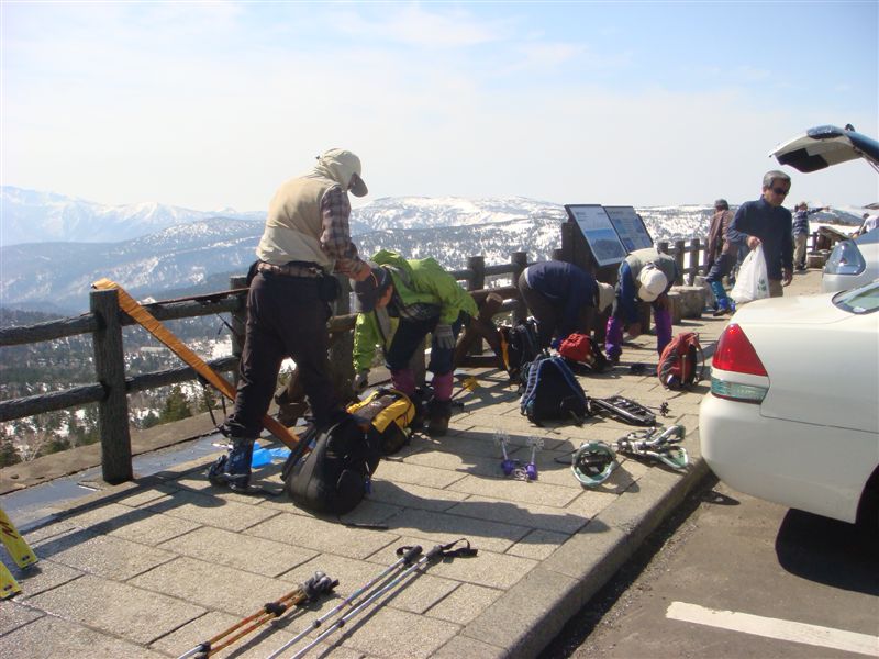 が・・・茶臼岳登山口バス停でスキーを車に載せて変える準備をしている人と交渉の結果、1名だけ乗れるので八幡平山頂駐車場まで同乗させてもらえることとなった。盛岡の方で同年輩くらいの方であった。どうもありがとうございました。私が載せてもらい車を乗り換えバス停へ向かい、もう一台の運転者+2名をと載せて山頂駐車場へ戻り順次帰宿した。