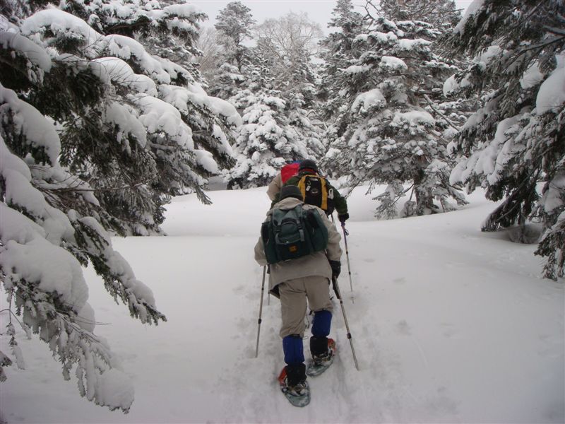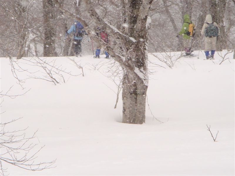 スノシュー組はリフト横のぶな林を降りていった。古太木もあり楽しかったようだ。
