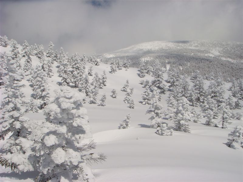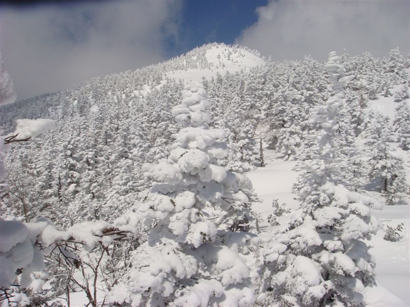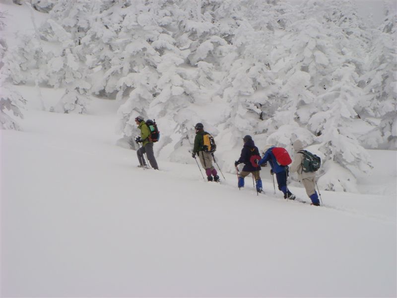 樹林帯をスノシュー4名、テレマーカー2人はガイドの案内で登っていった。真冬並みの寒気が入ったせいか樹氷も出来ていて冬山のようだ。