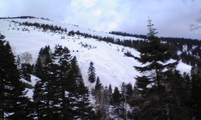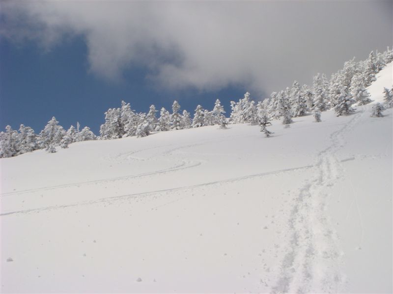 しかし、樹林帯は木が多く、新雪30Cmもちょっと重たい雪なのでスキーで滑るにはとてもきつくターンがうまくいかない。木がない斜面では新雪でターンも出来シュプールが残った。そして、何とか滑りやすそうな木々の間をぬって登山口まで降りてきた。