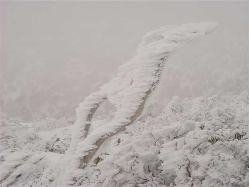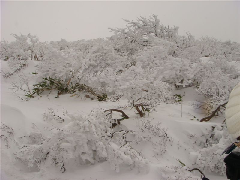 山頂でも天気がよく視界が良い。西大嶺山頂は360度のパノラマが楽しめる絶景ポイントだ。樹氷も見事だ。先週には全く樹氷はなくなっていて雪も黄砂で黄色かったとガイドが説明してくれた。寒風でとても寒いがいい日に来たと思った。