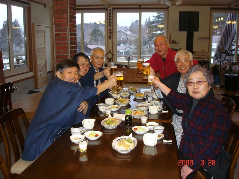 しかし足の筋肉は相当疲労している。掛け声をかけながらターンしてゲレンデを滑り降りるが何回も休憩しないと足が棒のようになりつりそうになった。スノシュー組はゴンドラに乗って楽々と下山し、皆そろったところで小野川荘に置いた車を取りに行き磐梯沼尻高原ロッジへと向かった。