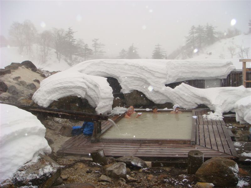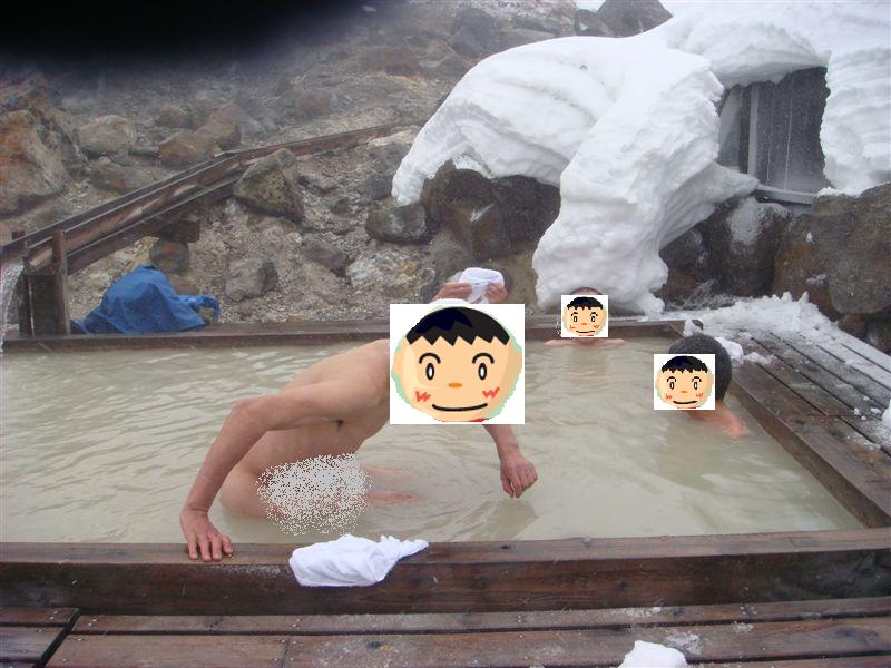 真冬で閉鎖中ではあるが蒸ノ湯の露天風呂は入ろうと思えば入れる。だが風雪激しい中で裸になる勇気はあるだろうか。気合が入らないと決断はなかなか出来ない。裸になっても入るときは熱くて大変そうだ。雪で温度調節をして入ったのだがごらんの通り入ってしまえば極楽だが入るまではあっちっちで寒いは熱いで大騒ぎであった。ちょっときわどい写真であったのでぼかしを入れました。