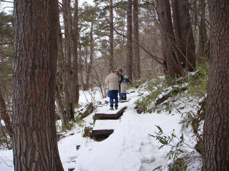 スノシューは必要ないほど五色沼の遊歩道は雪がない。気温は0~1度くらいであるが歩いていて調度良い。毘沙門沼からるり沼までを往復した。