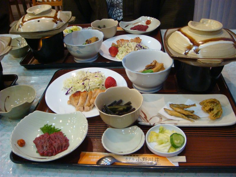 宿はホテル小野川荘で旅クラブの会員価格でなんと¥8,000.-のところ¥5,400.-で2食付で泊まれた。あまりにも格安なので夕食の料理を心配していたのだが写真のとおり豪華メニューであった。ビールと地酒で美味しくいただきました。