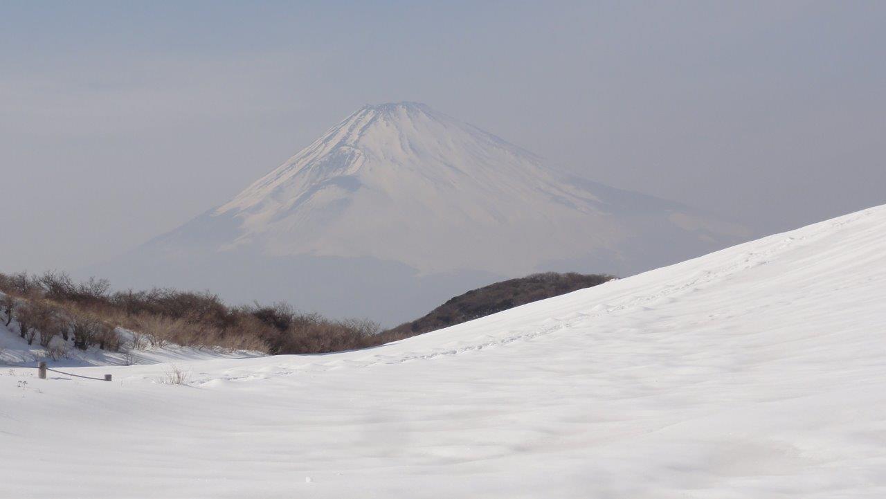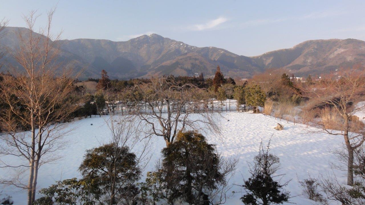 外輪山に夕日が映えて雪国にいるような雪原が箱根とは思えませんでした。