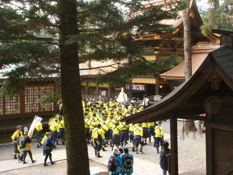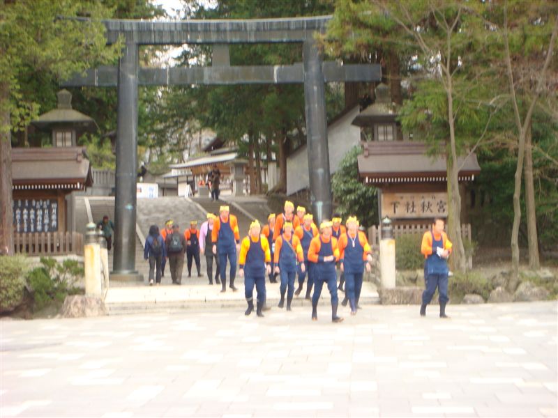 帰り道は下社春宮におまいりしていくことにしました。1本目の御柱を落とし終えた氏子さんたちがお参りに来ていました。事故もなく紙に感謝をしていたようです。