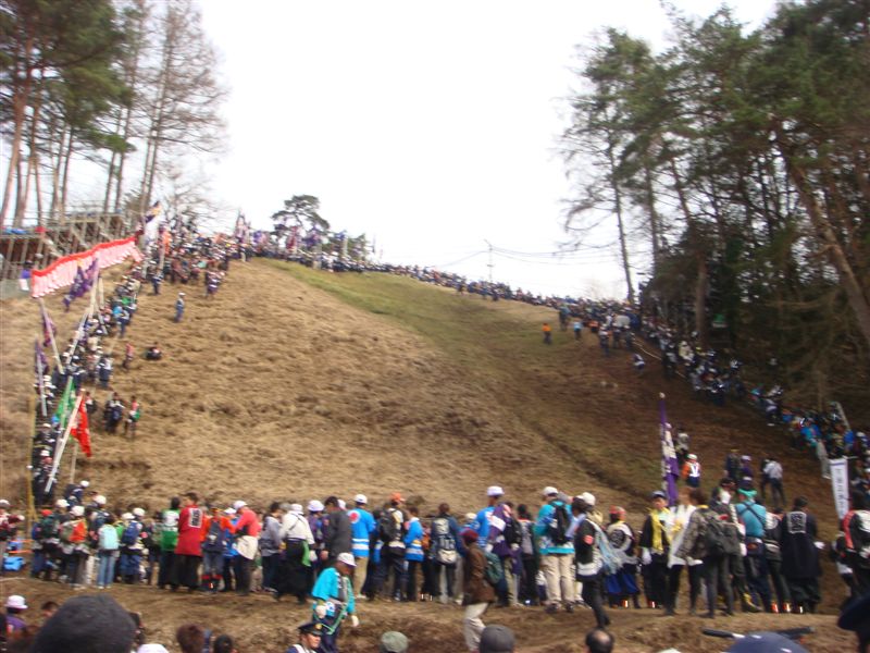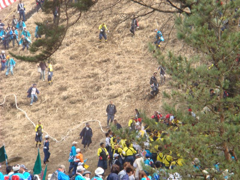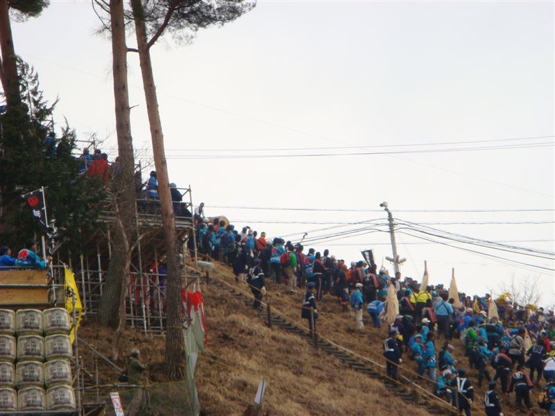 準備が整い木遣りとラッパがなっています。でもなかなか落ちてきません。
