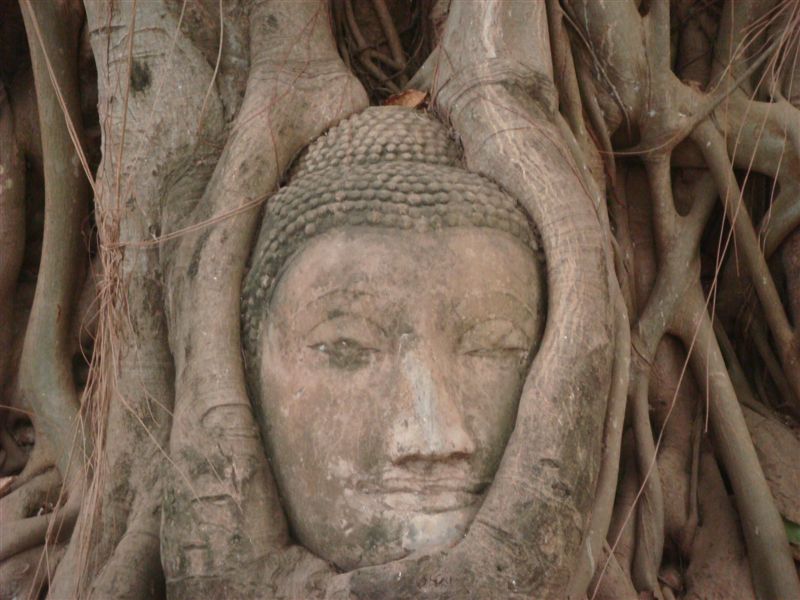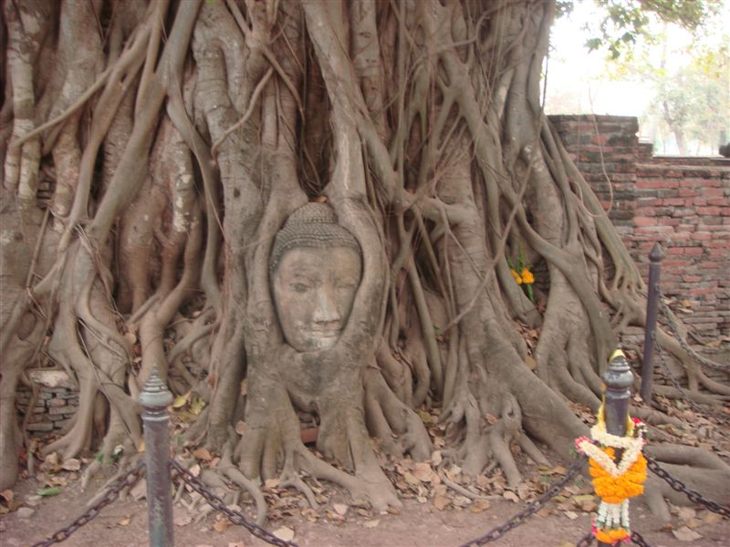 ワットプラマハタートは木の根に取り込まれた仏像頭部が有名です。