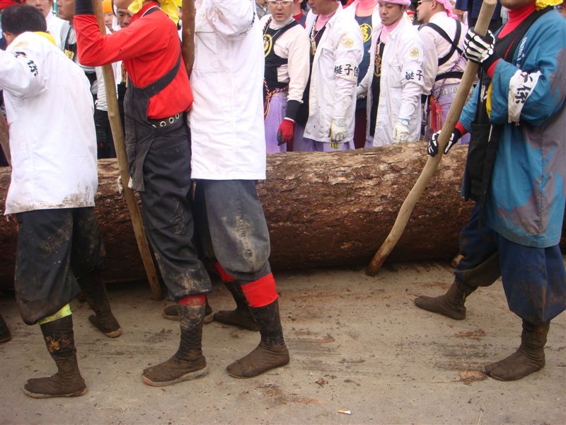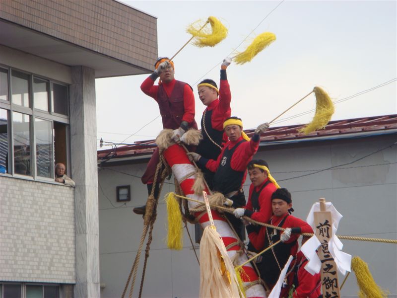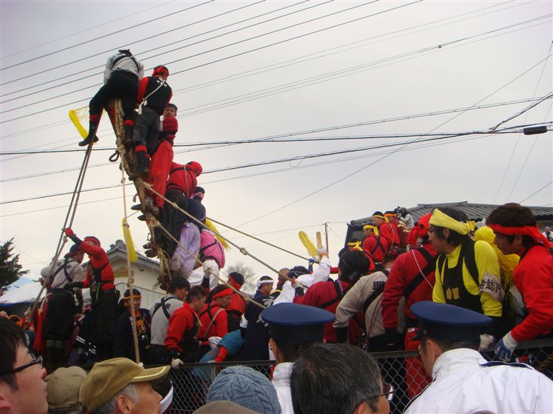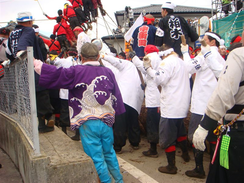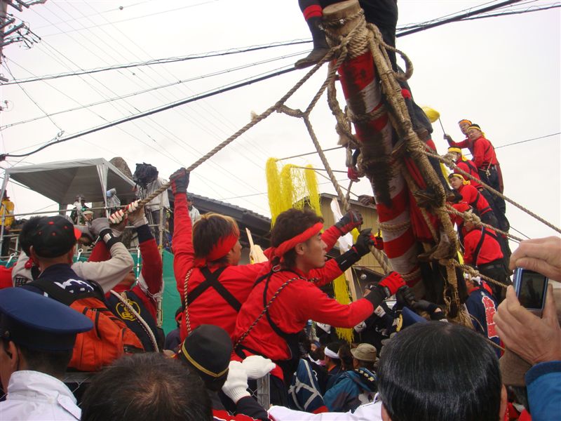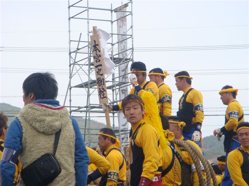 つのに乗っている人も雨で大変でしょうね。でも6年に一回のお祭りだから名誉になるのでしょう。