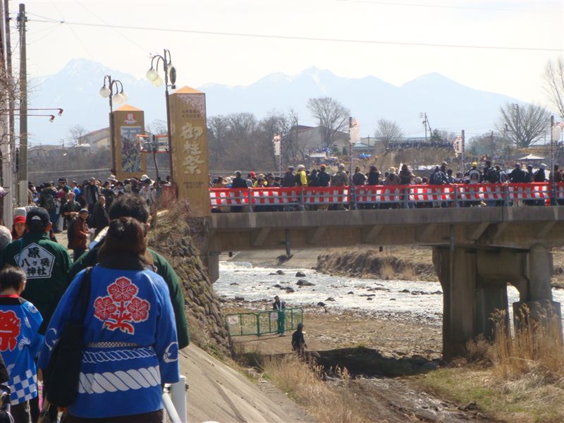 2日目の見せ場は2箇所あります。まずは木落坂からを御柱滑り落とすところです。観光ツアーで観覧席はほぼ埋まっているようです。有料観覧席は¥4,500。-しますので橋の袂から見学です。
