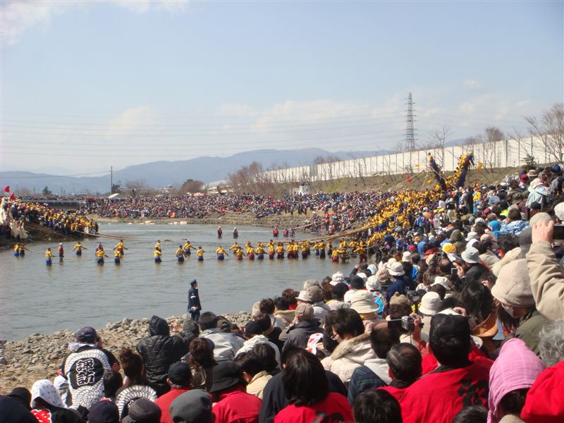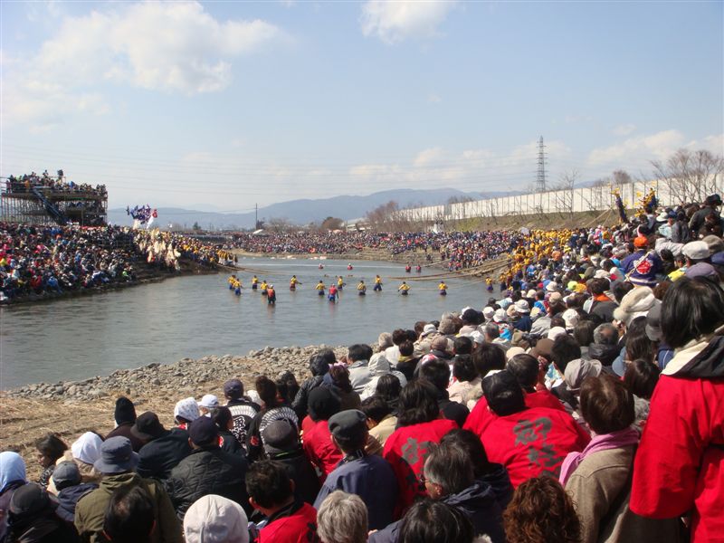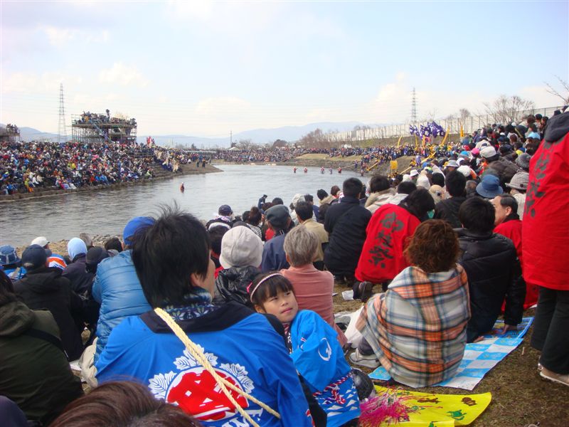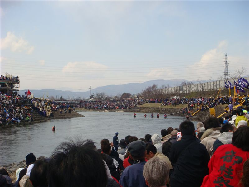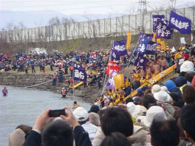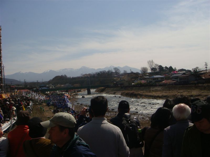 先頭の旗が川の中に入りだしました。褌です。寒そ~~。