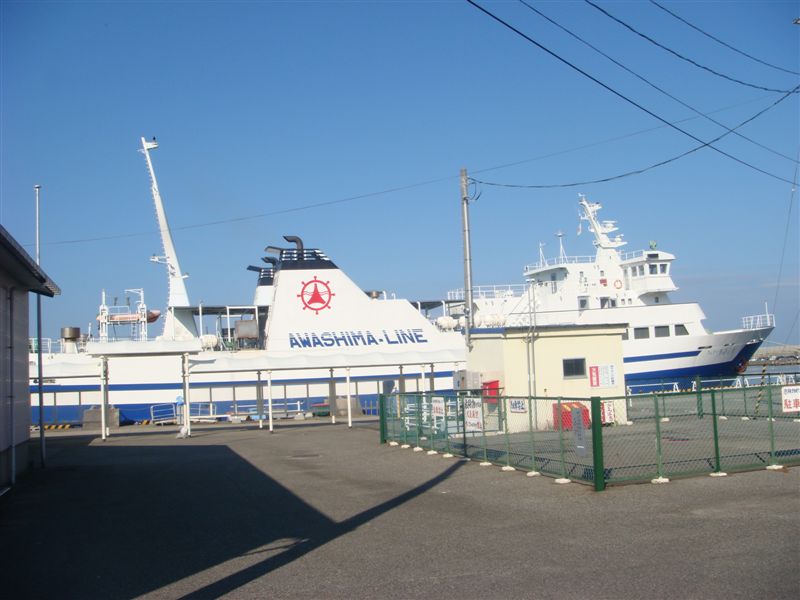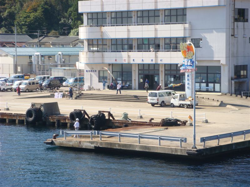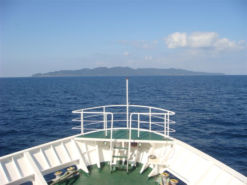 フェリーで1時間30分です。入港の時には大漁旗を振ってお出迎えをしてくれます。