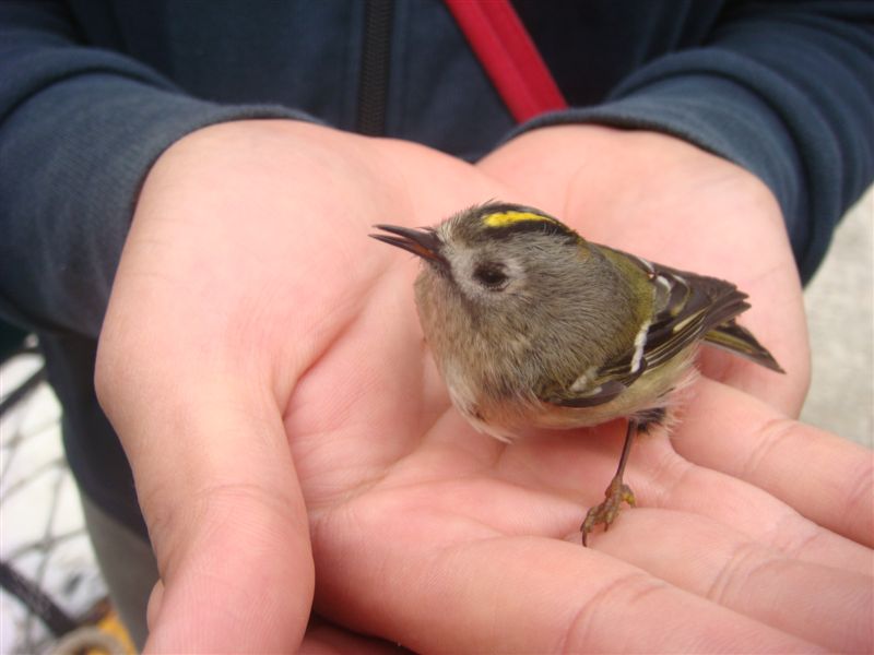 会の動植物博士がキクイタダキですと。私も帰って調べたら『(菊戴、学名Regulus regulus)はスズメ目キクイタダキ科の鳥の一種。和名は、頭頂部に黄色い冠羽があるため、『菊を戴く』という意味から命名された。』と出ていた。体長10センチぐらい、体重3~5gの小型の鳥で、日本国内では最小の鳥でした。普通は低いところは飛ばないようだが舟の窓ガラスに映った山の景色を見間違えて激突したのだろう。15分くらい手のひらにいたが脳震盪で気を失っただけのようで元気に山に飛んでいった。よかったよかった。