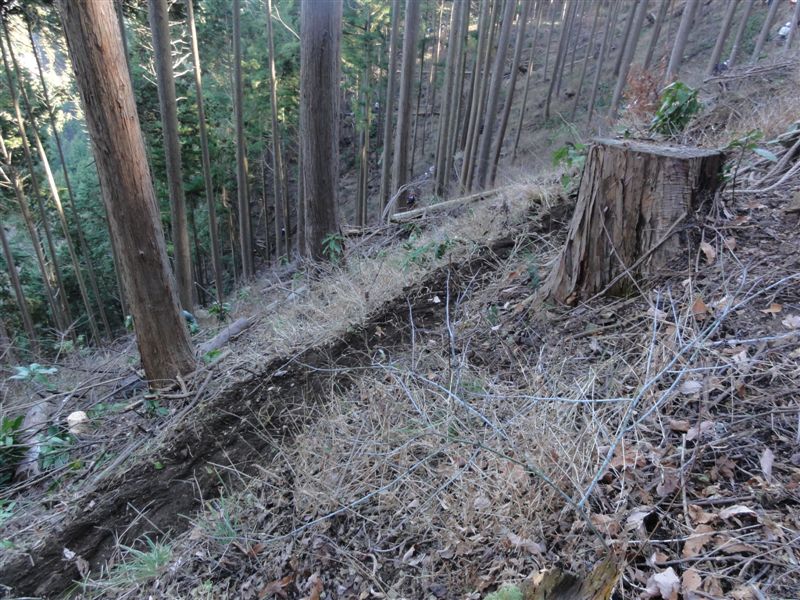 急斜面での作業はきついですが私は鍬でこれからの作業がしやすいように斜面に道を作りました。立派な道ですよ。