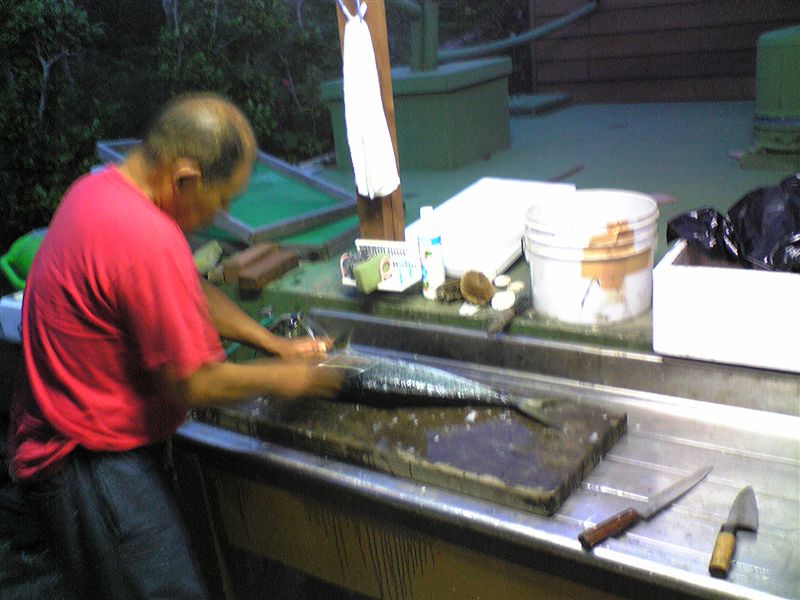 宿に戻りお風呂に入って汗を流して出てきたら、宿のオーナーが魚をさばいていました。
