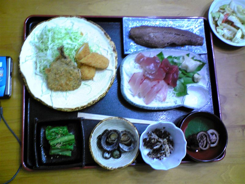今日もお刺身、煮肴、横節などの貝類魚のフライで豪華な食事です。