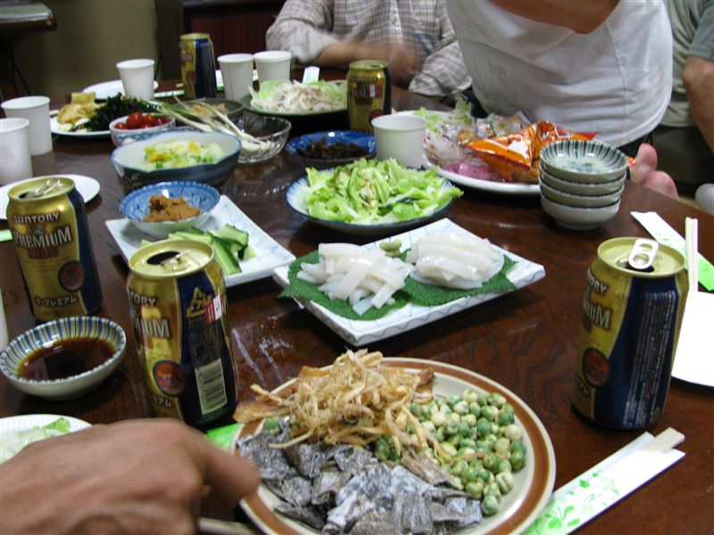 アカイカのおろし立ての刺身などがでて豪華です。夕飯でお腹一杯ですが美味しくて食べ過ぎ飲みすぎです。もう入らないかなというころにお開きです。7:00~10:00まで・・・