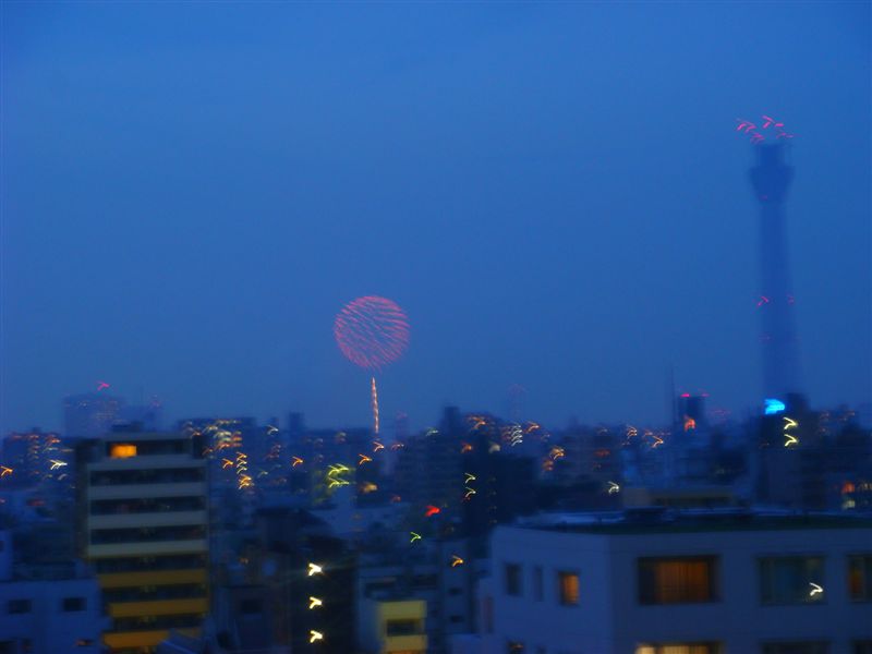 花火のシャッターチャンスは難しいですね。霞がかかっていたので少し残念ではありましたがこんなロケーションで見 れるのは幸運でしょう。再来年の花火大会にはスカイツリーも完成しているのでまたお邪魔したいですね。そのときはよろしく です。 夜遅くまでありがとうございました。